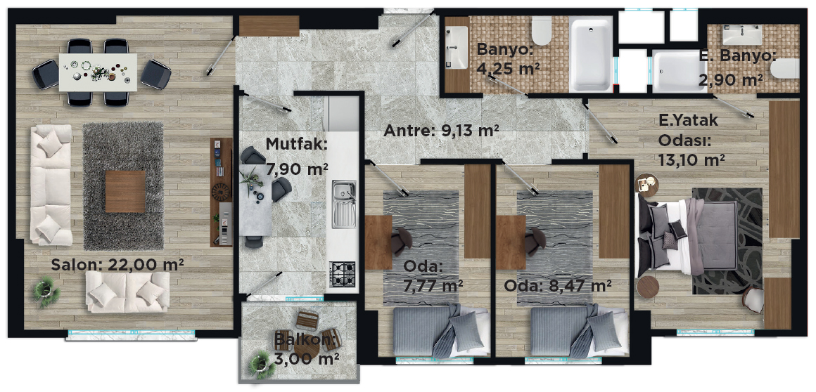 - Ebeveyn Yatak Odası 13,10 m²